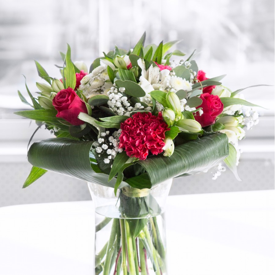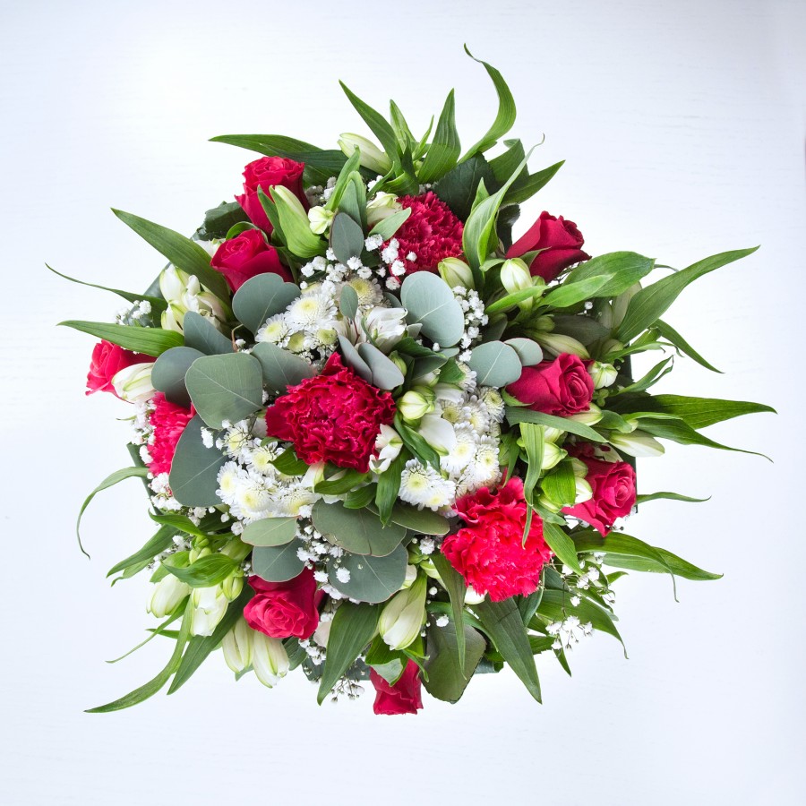 Celebrate life’s special moments with our radiant bouquet, artfully crafted with a selection of hand-picked flowers that promise both beauty and quality. This vibrant arrangement pairs the passionate allure of red roses with the crisp charm of white chrysanthemums, enriched by the soft, romantic touch of carnations and gypsophila. Added highlights of white alstroemeria and refined aspidistra leaves complete this luxurious display.